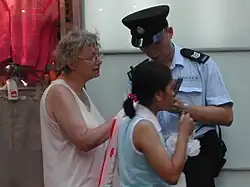 A woman asking a Hong Kong policeman for directions.