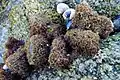 Codium sp. Easy[84] Slow[84] Fair[84] Moderate-High[84] High[84] No[84] Some forms of this algae feature a single holdfast with multiple irregular branches and others encrust surfaces taking on a blob-like shape. They should be placed on hard surfaces and kept in water temperatures under 80 °F (26.7 °C). Though the main structure of Dead man's fingers is inedible, some fish may graze on the fuzzy filaments that cover its surface.[84][85][86] 12 in (30.5 cm)[84]