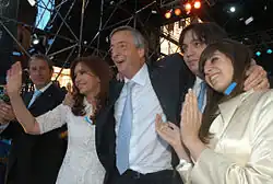 Cristina Fernández de Kirchner (president, 2007–2015), her husband Néstor Kirchner (president, 2003–2007) and their children, Máximo and Florencia, in 2007.