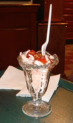 Shelled prawns in a pink sauce based on mayonnaise and tomato, served in a glass.[24] It was the most popular hors d'œuvre in Great Britain from the 1960s to the late 1980s. In North America the sauce is red, essentially ketchup plus horseradish.[24] | ||||