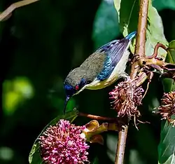 Nectariniidae is a family of passerine birds in the superfamily Passeroidea, comprising the sunbirds and spiderhunters.[1] Members of Nectariniidae are also known as nectariniids.[2] Their range extends from the Afrotropics north to the Levant and southern Arabian Peninsula, and east through South and Southeast Asia up to New Guinea and northern Australia.[3] They inhabit a wide variety of habitats, from arid savannah to tropical rainforests, and can be found from sea level to an altitude of 4,900 m (16,100 ft). Sunbirds are generally small birds with long, thin, down-curved bills and brightly coloured, iridescent plumages.[2] They display marked sexual dimorphism, and males are much more visually striking than females, who are usually dull green, brown, or grey. The spiderhunters (Arachnothera) are larger than other sunbirds and show less sexual dimorphism.[3]