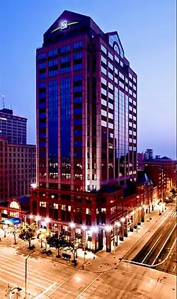 The history of high-rises in the United States city of Dayton, Ohio, began in 1896 with the construction of the Reibold Building. Although the Reibold Building was Dayton's first high-rise, the Centre City Building is often regarded as the first "skyscraper" in the city and was completed in 1924.[1] The original portion of the building opened in 1904, when the tower portion was completed two decades later, it was one of the tallest reinforced concrete buildings in the world, and the tallest in the United States.[2] Dayton went through an early building boom in the late 1920s, during which several high-rise buildings, including the Key Bank Building, were constructed. The city experienced a second, much larger building boom that lasted from the early 1970s to late 1980s. During this time, Dayton saw the construction of six skyscrapers, including the Stratacache Tower, also known as the Kettering Tower, and KeyBank Tower.