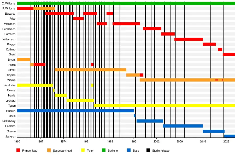 This page is a chronology of the Motown singing group the Temptations. It lists the members of the group during all phases of the group's history. While the Temptations have frequently changed their lineup, the group has always employed a person for each of the following roles: