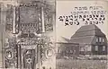1750–1941 | The synagogue building was a wooden structure built on a stone foundation. The walls of were cut from edged logs into a clean corner. The central log house was dominant in height, to which side log houses were adjoined as covered galleries. A pentagonal structure was added to the main facade, which covered the main entrance. The building was covered with a high gable roof, with a complex plan and numerous outbuildings. In the end of 19th - beginning of 20th century the roof was covered with tin.[6] The interior was almost entirely covered with magnificent polychromes made in 1745 by the Słuck painter Chaim ben Yitzchak ha-Levi Segal. Murals, made on boards, represented the images of 12 signs of the zodiac, mythical animals and cities. Some researchers noted that under the image of mythical cities features of Mogilev from the times of the Polish-Lithuanian Commonwealth were visible. These murals were studied by El Lissitzky and Issachar Ber Ryback. | ![]() ![]()