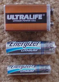 - ^ "Cylindrical Primary Lithium – Handbook and Application Manual" (PDF). data.energizer.com. Archived from the original (PDF) on 2006-03-17. Retrieved 2009-09-20.