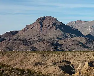 Little Christmas Mountain is part of the Christmas Mountains where it is set within Big Bend National Park and the Chihuahuan Desert. The mountain is composed of intrusive rhyolite (volcanic rock) which formed 33 million years ago during the Oligocene period.[4] Based on the Köppen climate classification, the mountain is located in a hot arid climate zone with hot summers and mild winters.[5] Any scant precipitation runoff from the peak's slopes drains into Rough Run → Terlingua Creek → Rio Grande. Topographic relief is significant as the summit rises 1,600 feet (488 m) above Rough Run in one mile (1.6 km). The mountain's toponym was officially adopted on March 9, 1939, by the United States Board on Geographic Names.[3][6]
