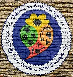 In 2023, Lambeth Council and the Mayor of London funded for a mural to be installed celebrating Little Portugal, this mural was painted by Eduarda Craveiro (of Portuguese descent) and Alex Bowie. The Coração de Viana (Heart of Viana, a traditional Portuguese symbol) is the central element, filled with the silhouettes of icons from Portuguese-speaking countries around the world. The colours inside are taken from the traditional dress of Madeira and also the flags of the Portuguese-speaking countries around the world. The mural was unveiled by Amy Lamé, the night czar at the time (on behalf of the Mayor of London), the Portuguese Consul, the Leader of the Council, Councillor Claire Holland and the Portuguese-speaking and local Councillor Diogo Costa for Oval ward.[5][6][7]