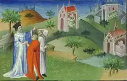Folio 45r, or The Khan's Money Exchange, shows a scene of trade between a seated khan and three men. The text on the same page, from Marco Polo's Description of the World, describes the novelty of the khan's paper money, noting that traders from far-off locales bring their wares in exchange for these slips of paper. The three men in the image serve as an example of this widespread interest, their hats and clothing suggesting they belong to different cultures. The inspiration for these figure's clothing could have originated from artistic contact between Europe and Asia but most likely originated from Italian art depictions of "Eastern" figures.[3] In either case, this folio serves as record of cross-continental trade.