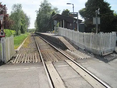 Like many of its neighbours, the station has only one active platform, no surviving permanent buildings and is located adjacent to an open level crossing. All northbound services are timetabled to stop here, however southbound services only call if requested to do so for unknown reasons. The station also has the usual collection of amenities common to others on this part of the line (waiting shelter, CIS display, timetable poster board and customer help point) as well as a payphone. Level access is available between the main entrance and platform.[2]