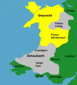 Wales c. 1217. Yellow: areas directly ruled by Llywelyn; Grey: areas ruled by Llywelyn's client princes; Green: Anglo-Norman lordships.
