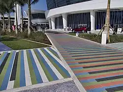 Loria, a notable art dealer, took the four bright primary colors off the palette of the late Catalan surrealist, Joan Miró, to conveniently label different zones around the park—green (outfield), red (third-base line), yellow (first-base line) and blue (behind home plate). "If you look carefully, in those sections, they dissolve into the next color, and the colors mix," Loria said.[39] Wide open plazas at the east and colorful west ends of the building, as well as a 360° concourse inside called the Promenade encourages fans to walk around—and to intermingle at stops such as the bars or the bobblehead museum. Dazzling colors are found throughout the interior, including fluorescent lime-green fences, and in modernist & contemporary works of art—including the much-debated animatronic home-run sculpture—that relate to baseball and Miami.