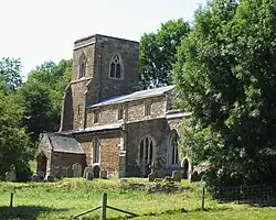 The earliest part of the Church of England parish church of St Michael and All Angels is the Norman south doorway, which is almost certainly 12th-century.[7] But the church was largely rebuilt late in the 13th or early in the 14th century. Later in the Middle Ages a Perpendicular Gothic clerestory was added to the nave. Fragments of Medieval stained glass survive in one window of the chancel. The pulpit is Jacobean. The church is a Grade II* listed building.[8]