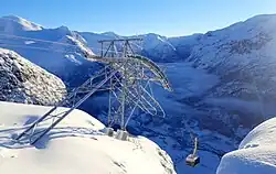 Loen Skylift is an aerial tramway in Loen in Stryn, Norway. The cable car climbs 1,011 metres (3,317 ft) to the top of Mount Hoven, above the Nordfjord. The maximum speed is 7 metres per second (23 ft/s).[1] With a gradient up to 60°, it is one of the steepest in the world.[2][3][4][5] The average is 45°. The gondola car is 170 metres (560 ft) above ground at the highest. It is the first aerial tramway installed in Norway since Hangursbanen in 1963.[6][2][3]