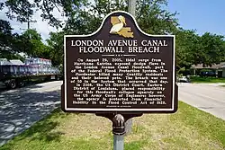 The London Avenue Canal is a drainage canal in New Orleans, Louisiana, used for pumping rain water into Lake Pontchartrain. The canal runs through the 7th Ward of New Orleans from the Gentilly area to the Lakefront. It is one of the three main drainage canals responsible for draining rainwater from the main basin of New Orleans. The London Avenue Canal's flood walls built atop earthen levees breached on both sides during Hurricane Katrina in 2005.