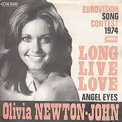 The BBC had internally selected Olivia Newton-John as its performed for the 19th edition of the Eurovision Song Contest. She introduced one of each of the six nominated songs on a broadcast of Jimmy Savile's Clunk Click television show on BBC One; on 23 February 1974 a television broadcast entitled A Song For Europe 1974 announced the tally of viewers' mailed-in ballots, with "Long Live Love" the clear victor at 27,387 votes, becoming the British entrant for Eurovision.[2] The runner-up, "Angel Eyes" –which was Newton-John's favourite–[3] gained 18,018 votes.[4]