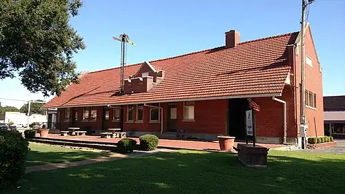 The former Rock Island Depot is a historic railroad station at the junction of Front and Center Streets in downtown Lonoke, Arkansas. It is a long, rectangular brick building, topped by a steeply pitched gabled tile roof. Its gable ends are partially stepped and raised above the roof pitch in the Jacobethan style. It stands south of the area where the Rock Island Line railroad tracks ran, and has a three-sided telegrapher's booth projecting from its north side. It was built in 1912, and served as a passenger and freight station for many years,[2] and now houses the local chamber of commerce.