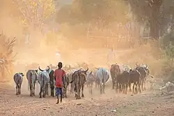 The main crops are sorghum, bulrush, millet, pumpkin, ground nuts, simsim, okra, syam, cassava, sweet potato, maize and mango.[19][20] They also harvest forest products, bamboo roots, coconuts, honey, shea nuts (pressed to make oil), figs, and many other sorts.[21]
