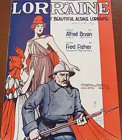 "Lorraine (My Beautiful Alsace Lorraine)" is a World War I era song released in 1917. Al Bryan wrote the lyrics. Fred Fisher composed the music.[1] It was published by McCarthy and Fisher, Inc.. André De Takacs designed the sheet music cover. It features a French soldier with his bayonet drawn in the foreground. A woman, who is a symbol of Liberty,[2] and child look on behind him.[3] The song was written for voice and piano.[4][5]