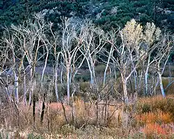Many threatened and endangered species live within the forest. Among them is the California condor (Gymnogyps californianus), for whom the United States Forest Service manages the Sespe Condor Sanctuary and the Sisquoc Condor Sanctuary.[7] Also present is the California mountain kingsnake, a California species of special concern. The American peregrine falcon is also entirely dependent on the forest for its survival. The mountain lion and California mule deer may be the most common large mammals. Bighorn sheep inhabit the Sespe Creek region of the forest.[8] American black bears browse on grasses, berries, and carrion.[9] Coyotes thrive everywhere in this forest. Bobcats can occasionally be seen in the more remote mountainous areas of the forest. Other animals found in this forest are raccoons, bluebirds, barn owls, red-tailed hawks, cottontail rabbits, bald eagles, jack rabbits, California quail, California scrub jays, and great horned owls.[10]
