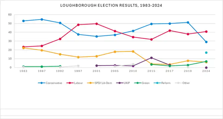 The last time that Loughborough was not represented by an MP from a governing political party was prior to the February 1974 general election, making the constituency a bellwether.
