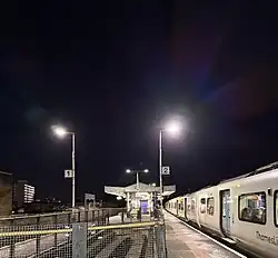 Looking north from Loughborough Junction station showing platform 1 and 2. The train on platform 2 is the Thameslink service to St Pancras.