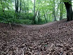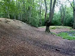 The southwestern edge of the camp falls away sharply to an area known as Kate's Cellar (a hermit who reputedly once lived in this area of the forest). An early 19th Century map shows Dick Turpin's hideout here (there are a number of locations within Epping Forest's 6,000 acres (24 km2) which claim the same).