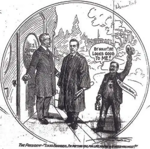 Political cartoon published February 6, 1916 in The Denver Post depicting "Mr. Common People" cheering as President Wilson brings Brandeis to the Supreme Court. Wilson himself exclaims, "Louis Brandeis, I'm putting you, for life, where we need you most!"