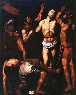 Other than the copies after Caravaggio made after 1606 such as Judith Beheading Holofernes (1607), there are almost no known paintings by Finson before 1610. The signed but not dated Venus and Cupid with an unlikely couple (At Dorotheum on 13 October 2010 in Vienna, lot 352) was likely made in Italy not long after his arrival in Italy and before his exposure to the naturalism of Caravaggio. It shows that at this time Finson was still influenced by the Mannerist school of painting at the court of Rudolph II in Prague, with its preference for exploring erotic motives as well as by the Mannerist style of Antwerp painters such as Jacob de Backer.[5] A Saint John the Baptist preparing himself for his martyrdom in a private collection was attributed to Finson in 2019 and is dated to approximately 1607. It shows Finson's confrontation with the work of Caravaggio. The painting offers an original interpretation of the subject. The foreground is dominated by the nude torso of the saint, shown in a submissive pose a few moments before his beheading. On the left are the heads of Salome and the old maid, who is close to the old maid in Caravaggio's File:Salome with the Head of John the Baptist-Caravaggio in the National Gallery in London.[12] A Caravaggesque painting of the Martyrdom of Saint Sebastian (Parish church of Rougiers, France) was previously dated 1615 but has now been dated 1610. This would place it in the Italian period of the artist.[5][12]