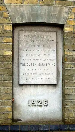 Plaque unveiled by Queen Mary on the Queen Mary Wing in 1926