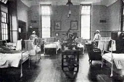 The new yellow-brick building with slate roofs echoed the construction materials used by its larger neighbour, the Cambridge Military Hospital. It cost £12,600 to build[3] and had "sanitary blocks" incorporated in "Italianate" corner towers towards the back.[4] There were fifty-three beds arranged in eleven wards of different sizes, including wards named for Queen Victoria, the Duke of Connaught and Lord Lansdowne. The staircases had shallow steps, supposed to help nurses in long dresses run up and down.[5] A "fine" tiled operating theatre was added in 1908 and officially opened by the Duchess in 1909. It had a new sort of "brilliant light" and Doulton basins and sinks "fitted with the latest kind of mixing valves for hot and cold water with elbow-action and sprays".[6] Within a couple of years the hospital was treating around 1000 cases annually: about half in its General Division and half in its Maternity Division which had twenty-five "swing cots" along with twenty-five beds.[6]
