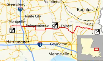 From the west, LA 40 begins at a junction with LA 43 between Montpelier and Albany in the northeast corner of Livingston. The highway crosses into Tangipahoa Parish after a short distance and passes through an interchange with I-55 (exit 40) just west of Independence. I-55 connects with Hammond, Louisiana to the south and Jackson, Mississippi to the north. LA 40 heads into town and follows West 3rd Street to a junction with US 51 (West Railroad Avenue), which serves local traffic along the I-55 corridor.[2][3][4][5]