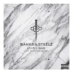 "Love and War" (stylized as "Love + War") is the debut single by Banks & Steelz, a collaborative project created by Interpol frontman Paul Banks and Wu-Tang Clan member RZA. Featuring a rap verse from fellow Wu-Tang Clan member Ghostface Killah, it was premiered on the Apple Music radio station Beats 1 on May 19, 2016.[1][2] It was subsequently released as a digital download, acting as the lead single from their debut studio album, Anything But Words (2016). A music video for the song, which pays tribute to the film Reservoir Dogs, was also released on May 20.