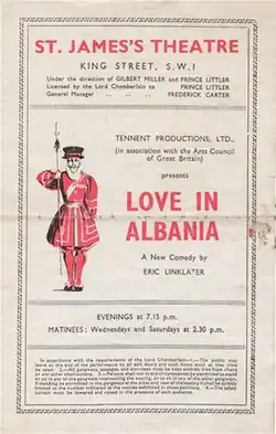 Love in Albania is a comedy play by the British writer Eric Linklater, which was originally performed in 1949.[1] After appearing at the Lyric Theatre, Hammersmith it transferred to St James's Theatre in the West End. Directed by and starring Peter Ustinov the cast also included Brenda Bruce, Molly Urquhart, Peter Jones and Robin Bailey. It was staged with the support of the Arts Council of Great Britain. Ustinov played a buffoonish American military policeman searching for his long-lost daughter in wartime London.[2]