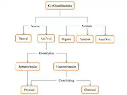 Gels can be organized according to multiple characteristics. The source of the gel (natural/artificial), the gel's medium (organic/aqueous/areo/xero), the constitution of the gel (macromolecular/supramolecular), and the type of crosslinking the gel forms (physical/chemical).