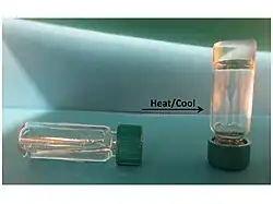 Molecular gels can be sensitized toward an external stimuli aka light, heat, or chemicals. Also, LMOG's can be sensitized by the incorporation of a receptor unit or a spectroscopically active unit into the gelator molecule.[30] A variety of quinoxalinones were recently developed that act as a mercury sensor by forming a gel when these ligands complex to mercury.[31] A nonplanar dihydropyridine derivative was induced to gel upon oxidizing the molecule with nitric oxide and then dissolving the oxidized ligand in DMSO/water and then heating and cooling the mixture. This gel has a useful application as it can therefore act as a nitric oxide sensor.[32]