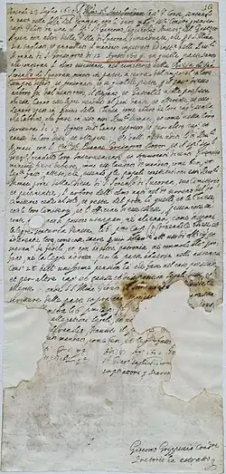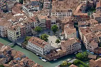 In 1598, an incident occurred which resulted in an urban legend known as The Ghost of Fosco Loredan.[92] In a burst of anger resulting from jealousy of his wife Elena who attracted many suitors, in this case her cousin of the Mocenigo family, Fosco Loredan murdered her at Campiello del Remèr by decapitating her, and was then ordered by her uncle, Doge Marino Grimani, to walk to Rome while carrying her disfigured body on his back to ask for the Pope's forgiveness, as he was the only one who could grant it to a noble of the rank of Loredan.[93] After hearing the story, Pope Clement VIII did not want to see him, and, out of desperation, Fosco escaped the guards who were going to imprison him and went back to Venice, where he drowned himself in the Grand Canal. Supposedly, on the anniversary of his wife's killing, his ghost can be seen wandering the streets of Venice at night searching for peace, the peace he lost in the burst of anger on the night he tragically murdered his young wife.[94]