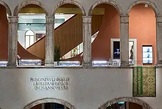 Around this time, Leonardo's cousin Andrea Loredan, known as a collector of art, commissioned the Ca' Loredan Vendramin Calergi, a palace on the Grand Canal, to designs by Mauro Codussi.[69] The palace was paid for by the doge. Andrea also commissioned and paid for the choir of the church of San Michele in Isola, also designed by Codussi. In 1513, during the War of the League of Cambrai, he had to accept the role of quartermaster-general for the army, and he died in the Battle of La Motta in the same year, beheaded by two soldiers who fought over his body.[11]