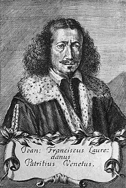 Giovanni Francesco Loredan, born in 1607, was a writer and politician. He was born in Venice as the son of Lorenzo Loredan and Leonora Boldù. When both of his parents died while he was very young, he was raised by his uncle Antonio Boldù and had as his teacher Antonio Colluraffi.[95][96]