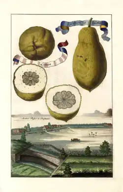 The fruit resembles a pear in shape, has a thick peel and is not very juicy. Like a citron, it can grow to a formidable size.