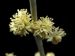 Lunasia amara is a shrub that typically grows to a height of 2–3 m (6 ft 7 in – 9 ft 10 in), sometimes a small tree, with its young shoots, twigs and leaves covered in star-shaped hairs or scales. The leaves are simple, narrowly egg-shaped with the narrower end towards the base, 55–60 mm (2.2–2.4 in) long with toothed or lobed edges and many oil dots. Separate male and female flowers are arranged in clusters about 3–6 mm (0.12–0.24 in) in diameter, the male flowers sessile with petals about 1 mm (0.039 in) long and 3 stamens. Female flowers are on a short pedicel, the petals 2.0–2.3 mm (0.079–0.091 in) long and densely hairy carpels with 1 ovule per locule and 3 styles. The fruit has up to 3 follicles 6–15 mm (0.24–0.59 in) long and 5–10 mm (0.20–0.39 in) long and joined at the base, each containing a single seed.[5][6]