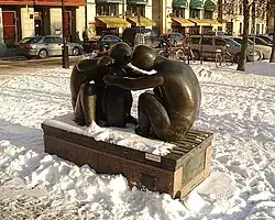 On the square is the bronze sculpture on a granite base: Familjen ("The Family") by Pye Engström from 1972–1973. The individual figures – a mother, a father, and a child – can be moved and rotated along tracks in the base. The sculpture is an enlarged copy of a piece first exhibited in the 1960s.[3][4]