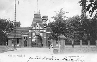 The gatehouse entrance to the Möller Colliery in Gladbeck as depicted on a vintage postcard, circa 1904.