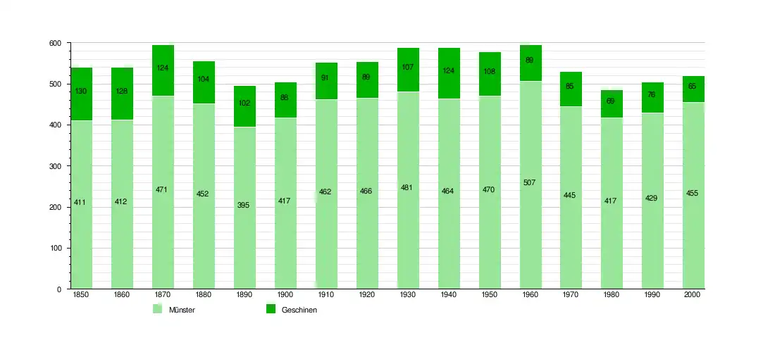 Münster-Geschinen had a population (as of 2015) of 489. As of 2008, 12.2% of the population are resident foreign nationals.[6] Over the last 10 years (1999–2009 ) the population has changed at a rate of -9.2%. It has changed at a rate of -11.3% due to migration and at a rate of -5.5% due to births and deaths.[5]