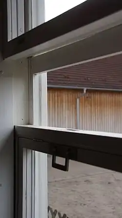 The windows were provided with counterweights and retractable fly screens and could be lowered down into the wall opening as in a railway carriage. A factory built steel wall, which included the water and waste water pipes, was installed between the kitchen and bathroom with the particularity that the bathtub of the narrow bathroom protruded through the wall to save space in the cabinet of the sink. Closets were used to build the remaining interior walls.[6] The quality of the MAN steel houses proved to be excellent in comparison to the competition of that time. Due to the good thermal insulation, the hot-dip galvanized components and the heat treated paints, there were very little corrosion and condensation problems.[7]