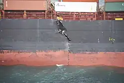 On 8 January 2012, it was reported that the Rena had broken in two, and while the bow section remained firmly grounded on the reef, the split had caused both sections to slew away from each other and settle lower in the water.[22] This caused further debris and oil to be released into the sea. By 10 January the stern section had been submerged almost completely,[6] and on 4 April it slipped further down the reef and disappeared completely from the surface.[23]