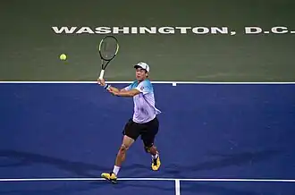 McDonald began his US Open series at the Atlanta Open. He lost in the first round to Emil Ruusuvuori, who would end up reaching the semifinals.[41] Next, he competed at the Citi Open in Washington, D.C. He upset defending champion, Nick Kyrgios, in the first round.[42] He defeated compatriot, Denis Kudla, in the quarterfinals to reach his second Tour-level semifinal and first at the ATP 500 level.[43] In the semifinals, he beat 2015 champion, Kei Nishikori, in three sets to reach his first ATP final.[44] He lost in the final to 5th seed and world No. 24, Jannik Sinner, in three sets.[45] As a result, he returned to the top 100 for the first time in 2 years, climbing more than 40 positions up in the rankings to world No. 64 on August 9, 2021. At the National Bank Open in Toronto, he fell in his first-round match to Benoît Paire.[46] At the Western & Southern Open in Cincinnati, he was defeated in the second round by top seed and world No. 2, Daniil Medvedev.[47] Ranked 61 at the US Open, he upset 27th seed and world No. 30, David Goffin, in the first round.[48] He lost in the second round to 2014 finalist Kei Nishikori.[49]