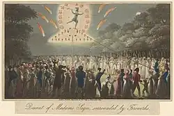 The end of the Napoleonic Wars opened up Britain's borders for French performers. In April 1816 Madame Saqui performed at the Covent Garden Theatre, "descending a tightrope stretched at an incline over the auditorium". This made her famous in Britain and her performance was drawn by George Cruikshank in A Wonderfull (sic) Thing from Paris, or, Madame Sacchi Gratifying John Bull's Curiosity.[10] Following this success, she was hired to perform at Vauxhall Pleasure Gardens for parts of the next four years, where she appeared under the patronage of the Prince Regent.[11]