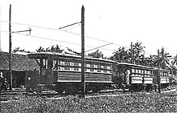 The Mae Klong Railway was built in two separate stages. The Tachin Railway Ltd, founded in 1901 with a concession from the crown of Thailand to construct a line to Samut Sakhon from Bangkok,[6] built the 33 kilometer Mahachai Line; it opened in 1904 with eight stations. A year later, The Maeklong Railway Company opened the 34-kilometer Ban Laem Line, using three steam locomotives.[7][5] The lines merged in 1907 to form the Maeklong Railway Ltd. It was originally opened as a goods line, transporting produce from the fishing ports of Samut Sakhon and Samut Songkram to the Bangkok markets.[3] The Government of Thailand purchased the now-merged company in 1926 and electrified the eastern section, turning it into an interurban tramway.[8] The Thai military later gained control of the railway in 1942, during World War II, and the line was brought under the control of the State Railway of Thailand in 1952 and fully merged into it by 1955.[9][5] During this period of merger, the electrification was removed from the eastern section, with steam-hauled and later diesel-hauled trains replacing the old tramcars in 1959.[7] In 1961 the line's original terminus at Pak Khlong San was closed and replaced with a bus stop, to ease traffic congestion in Bangkok, with Wongwian Yai becoming the new terminus.[5]