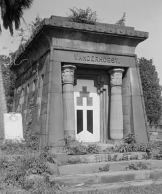 The location of the cemetery had previously been a plantation known as Magnolia Umbra, the house of which was described as a newly built house with five rooms in 1820.[6] The cemetery was constructed during 1850, on plans laid out by Edward C. Jones, and included a Gothic chapel also designed by Jones which no longer exists.[7] The chapel, which was located near the central lake, remained under construction until early 1851.[8] Both the chapel and the porter's lodge sustained very heavy damage during the cemetery's occupation by federal forces during the Civil War.[9][10] The porter's lodge at the entrance was demolished in 1868, but the chapel continued to be used until at least 1876.[11][12]