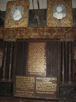 De la Gardie is known as being an eager constructor and the amount of different building projects he was running was huge. In 1674, the Italian diplomat Lorenzo Magalotti estimated that De la Gardie had at least 50 on-going projects in Sweden and its provinces, excluding the 37 churches he was constructing or repairing at the time.[10] One of the churches De la Gardie restored was the abbey church of Varnhem, in which he established a family mausoleum where Magnus Gabriel himself, his wife Maria Eufrosyne, their son Gustav Adolf and daughter-in-law Elisabet Oxenstierna are buried.[25]